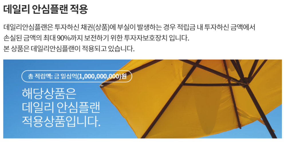 원금 보장은 유사 수신 행위로 명백한 불법이다. (신고 : 국번 없이 1332) 하지만 데일리펀딩에서는 손해가 발생했을 경우 투자자들에게 돌아갈 피해를 줄이기 위한 장치를 법을 벗어나지 않는 선에서 마련해 두었다. '데일리 안심플랜'이라는 장치인데 설명은 아래와 같다.