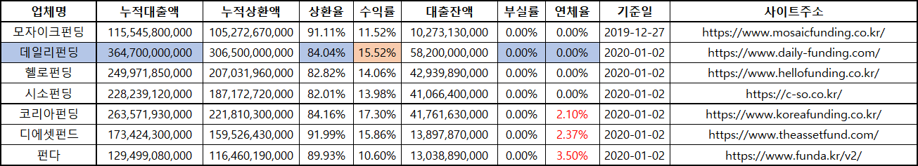 데일리펀딩 홈페이지의 한 탭을 보면 '데일리연구소'라는 항목이 있다. 그 항목을 들어가보면 'P2P공시'라는 것이 있어서 20년 1월 3일 기준 P2P 연계 대부업 등록 123개 업체의 정보들을 확인할 수 있다. 지표들을 확인해보면 누적 상환액 1000억을 넘긴 P2P 업체들 중 상환률이 80% 이상이면서 연체율, 부실률이 모두 0%인 업체는 데일리펀딩 포함 4곳 뿐이며, 이들 중 데일리펀딩의 평균 수익률이 가장 높다. (연체 : 30~90일 기간동안 상환 지연, 부실 : 90일 이상 장기 연체) 아래 이미지는 데일리연구소에서 제공하는 엑셀 파일을 다운받아 누적대출액, 상환율, 부실률, 연체율 순으로 기준을 잡아 내림차순 정렬한 결과이다.